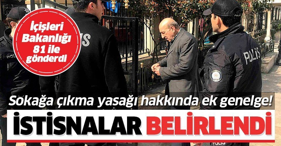 İçişleri Bakanlığı 81 İl Valiliğine 65 yaş ve üstü ile kronik rahatsızlığı bulunanlar için uygulamaya konulan "sokağa çıkma yasağı genelgesine ek bir genelgeyi bu gece saat 01.00'da valiliklere gönderdi. Valiliklere gönderilen ek genelge ile 65 yaş ve üstü ile kronik rahatsızlığı bulunanlar için uygulamaya konulan sokağa çıkma yasağı kapsamında getirilecek istisnalar belirtildi.