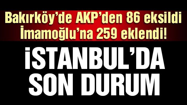 Bakırköy‘de CHP Parti Meclisi Üyesi Emine Gülizar Emecan’ın bildirdiği verilere göre, AKP’nin oyu 86 azaldı, CHP’nin oyu 259 arttı.