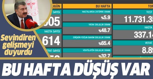 Koca açıklamasında, "Bugün toplam ağır hasta sayımız 1.417. Yoğun bakım doluluk oranlarımızda bu hafta düşüş var. Hastalarda zatürre oranı da geçen haftaya göre düştü. Tedbirler birlikte ve sürekli uygulandığında sonuç veriyor. Birlikte başaracağız, güvenin." ifadelerine yer verdi.