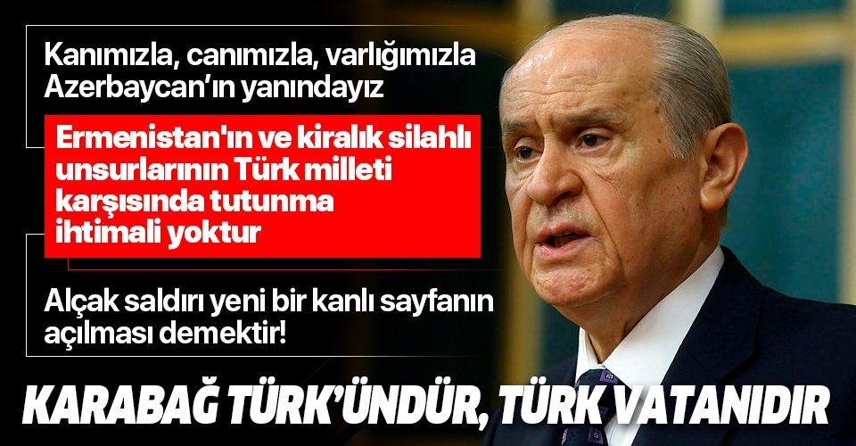 MHP Genel Başkanı Devlet Bahçeli, Ermenistan'ın Azerbaycan'a yönelik saldırısına tepki göstererek, "Karabağ Türk'ündür, Türk vatanıdır. Hiç kimse bu muhkem ve müstesna gerçeği değiştiremeyecektir. Kanımızla canımızla varlığımızla Azerbaycan'ın yanındayız" dedi.