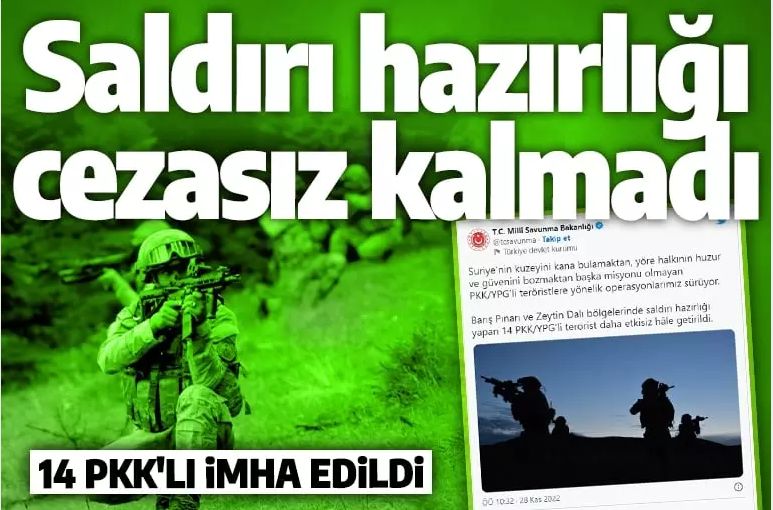 MSB'den yapılan açıklamada, "Suriye’nin kuzeyini kana bulamaktan, yöre halkının huzur ve güvenini bozmaktan başka misyonu olmayan PKK/YPG’li teröristlere yönelik operasyonlarımız sürüyor. Barış Pınarı ve Zeytin Dalı bölgelerinde saldırı hazırlığı yapan 14 PKK/YPG’li terörist daha etkisiz hâle getirildi." ifadelerine yer verildi.