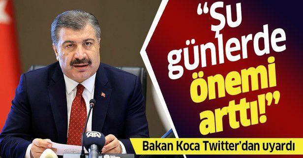 Bakan Koca, Twitter hesabından açıklama yaptı. Bakan Koca, maske ve sosyal mesafenin birlikte uygulandığında tam tedbir olduğuna dikkat çekerek, "Dışarı çıkarken maskenizi kuralına uygun şekilde takın. Sosyal mesafeyi 1,5 metrede tutmak için her ortamda dikkatli olun. El hijyenine daha fazla önem verin. Çoğumuzun sokağa çıkabildiği günlerde tedbirlerin önemi arttı'' ifadelerini kullandı.