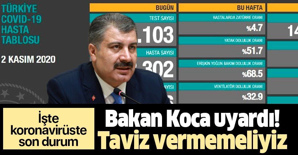 Son dakika... Sağlık Bakanlığı 2 Kasım koronavirüs hasta ve vefat sayılarını duyurdu. Bakan Koca açıklamasında "Bugün tespit edilen 2.302 hastamız var. Ağır hasta sayımız bugün düne göre 164 artarak 2.341'e ulaştı. Salgınla mücadelede sadece sağlık çalışanlarının fedakârlığı ile başarılı olamayız. Hep birlikte mücadeleye katılmalı ve tedbirlerden taviz vermemeliyiz." ifadelerini kullandı.