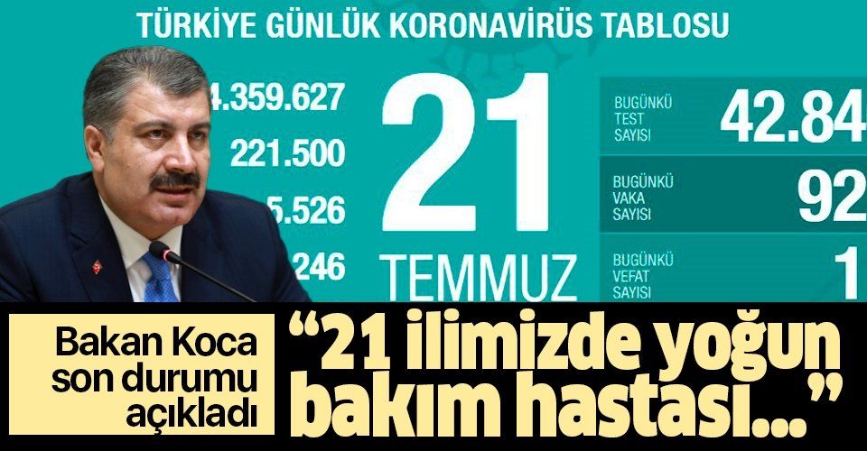 Son dakika haberi... Sağlık Bakanı Fahrettin Koca 21 Temmuz koronavirüs vaka ve vefat sayılarını içeren tabloyu paylaştı. Koca açıklamasında, "Son üç gündür 71 ilimizde pnömonili vaka sayıları azaldı, 21 ilimizde yoğun bakım hastası yok." ifadelerine yer verdi. Son üç gündür 71 ilimizde pnömonili vaka sayıları azaldı, 21 ilimizde yoğun bakım hastası yok. Hastalığın ülkemizdeki seyrinin gösterildiği detaylı grafik, günlük ve haftalık COVID19 durum raporları ve diğer önemli bilgiler için linkimiz: https://t.co/RVlhe7786O pic.twitter.com/Q4yg4zCxN8