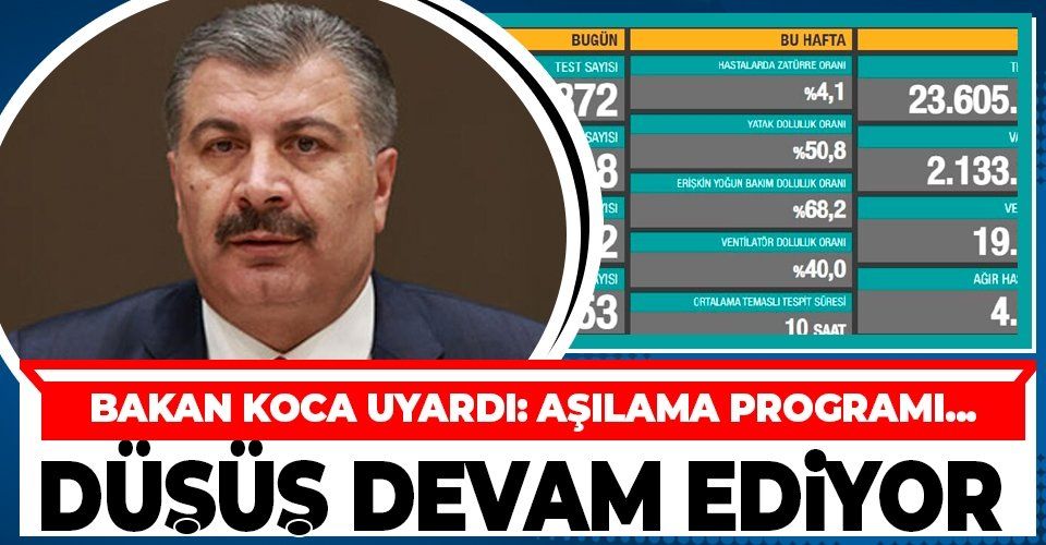 Sağlık Bakanı Fahrettin Koca Twitter'dan yaptığı açıklamada, "Bugün tespit edilen 3.002 yeni hasta var. Vaka sayısı, aktif vaka sayısı ve hasta sayısı düşmeye devam ediyor. Ağır hasta sayımızdaki düşüş de devam ediyor. Bu güzel haberleri sürekli hale getirecek olan aşılama programı etkisini gösterene kadar mücadele." ifadelerini kullandı.