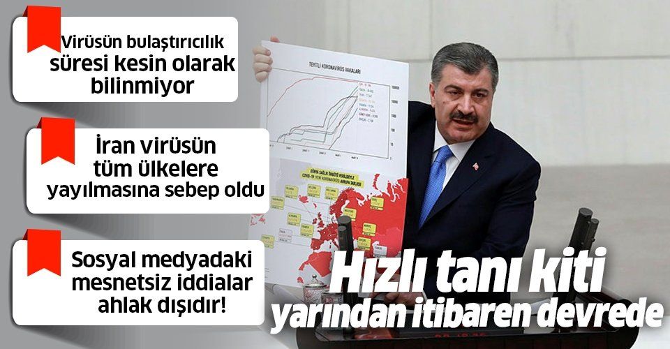 Türkiye'de koronavirüs testinin tüm büyük şehirlerde yapılabileceğini söyleyen Koca, hızlı tanı kitinin yarından itibaren devreye gireceğini de bildirdi..
