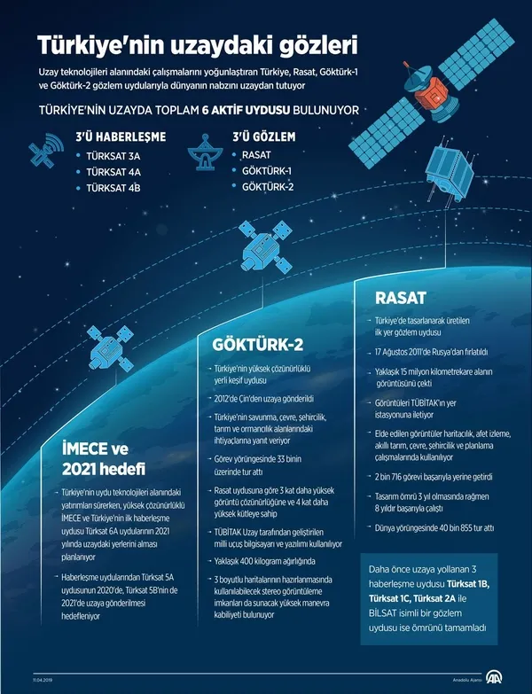 Uzayda uydu sahibi 30 ülkeden biri olan Türkiye'nin aktif uydu sayısı, haberleşme uydusu Türksat 5A'nın da fırlatılmasıyla 4 olacak.