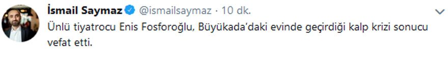 Gazeteci İsmail Saymaz da acı haberi sosyal medyadan duyurdu.