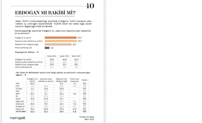 Metropoll Araştırma tarafından Mart ayında yapılan ankette, "Cumhurbaşkanlığı seçiminde Erdoğan'a mı, yoksa onun karşısındaki rakiplerine mi oy verirsiniz?" diye soruldu.