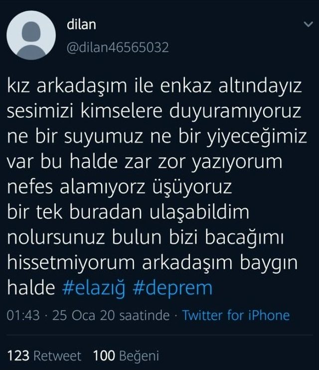 Türkiye, Elazığ ve Malatya'yı vuran depremin şokunu yaşarken binlerce insan depremzedelere yardımcı olmak için sosyal medya üzerinden iletişime geçti. Kimi adres verip "Gelin bende kalın" dedi, kimi yaşam belirtisi olan enkaz bölgelerinin yerini paylaştı. İnsanlıktan nasibini almamış bazı insan müsveddeleri ise twitter'da sahte hesap açıp, "Enkaz altındayım. Yardım edin" şeklinde paylaşımlarda bulundu.