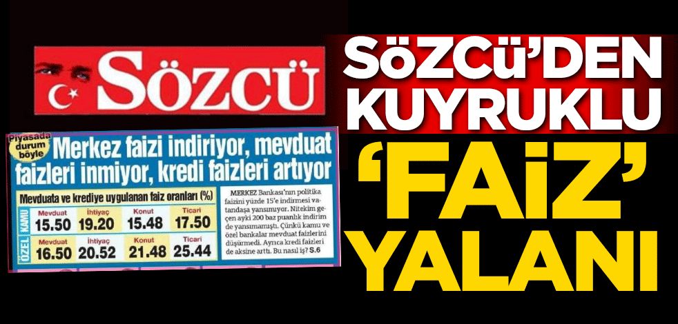 Ancak Türkiye'deki faiz oranlarının düşmesinden rahatsız olan solak zihniyet yine rahat durmadı. Dünkü faiz indirim kararının ardından harekete geçen Sözcü gazetesi, kamu bankalarının yaptığı faiz indirim açıklamalarını görmezden gelerek "Merkez faizi indiriyor, mevduat faizleri inmiyor, kredi faizleri artıyor" başlığıyla topluma yalan pompaladı.