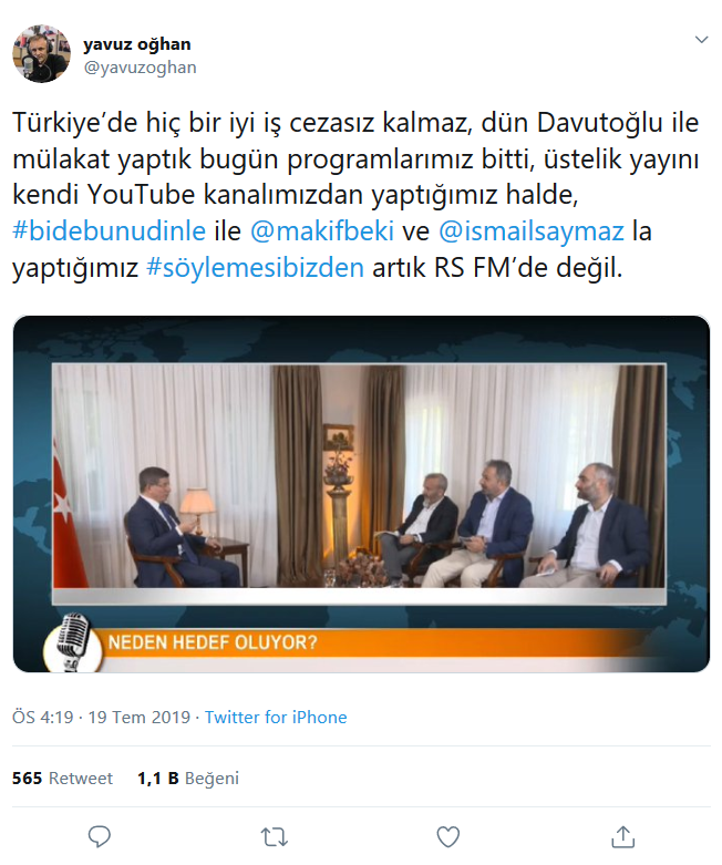 Sosyal medya hesabından açıklama yapan Oğhan, dün eski Başbakan Ahmet Davutoğlu'nun konuk edildiği "bidebunudinle" programından sonra Sputnik'in programlarını sonlandırdığı açıkladı. Oğhan ayrıca kendisiyle birlikte İsmail Saymaz ve Akif Beki'nin yaptığı "söylemesibizden" programının da artık RS FM’de yayınlanmayacağını açıkladı.
