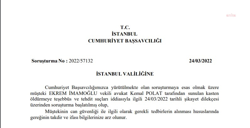 "Cumhuriyet Başsavcılığımızca yürütülmekte olan soruşturmaya esas olmak üzere müşteki Ekrem İmamoğlu, vekil Avukat Kemal Polat tarafından sunulan kasten öldürmeye teşebbüs ve tehdit suçları iddiasıyla ilgili 24/03/2022 tarihli şikâyet dilekçesi üzerinden soruşturma başlatılmış olup, müştekinin can güvenliği ile ilgili olarak gerekli tedbirlerin alınması hususunda gereğinin takdir ve ifası bilgilerinize arz olunur.”