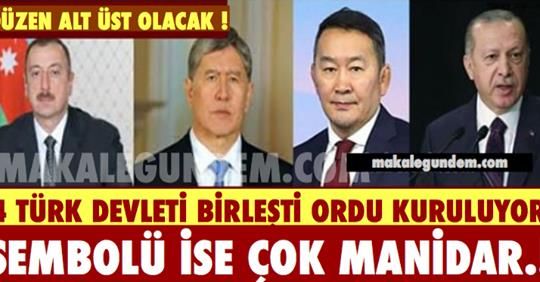 Türkler sonunda birleşti 4 Türki Cumhuriyet ortak Ordu Kurdu bu kurulan Teşkilatın en önemli amacı ise Türk cumhuriyet leri arasındaki askeri işbirliğini kuvvetlendirmek daha yakın dirsek temasında bulunmak Türk Devletlerini birleştirmek bu Örgütün ana karargâhı Ankara’da bulunacak.Ve en sonunda tam 4 ülkeden oluşan Türk ordusu kuruldu ülkeler arasında Türkiye Azerbaycan Kırgızistan ve Moğolistan bulunmakta. bu oluşumun temelleri ta 2011 yılına kadar uzanmakta fakat engellemelerle karşılaşıldı.