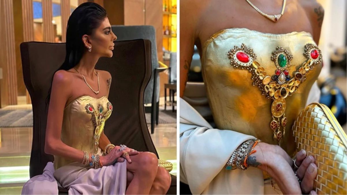 Son dönemdeki zayıflığı ile dikkatleri üzerine çeken sosyetik güzel Süreyya Yalçın, son olarak 3 milyon TL değerinde altın kaplama, elmas ve yakut taşlarıyla süslenmiş bir elbise giydi.
