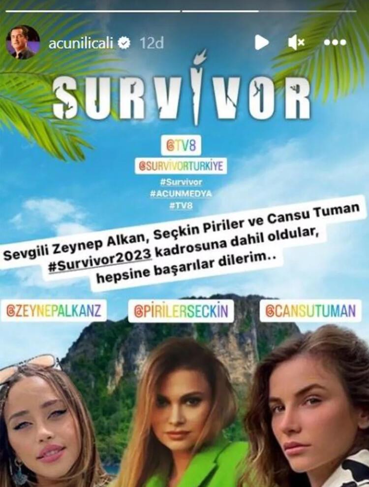 Acun Ilıcalı bu sefer de kadın yarışmacılardan bazılarını açıkladı.Acun Ilıcalı son olarak yaptığı paylaşımda Hamdi Alkan'ın kızı Zeynep Alkan, Seçkin Piriler ve Cansu Tuman'ın Survivor yarışmacısı olduğunu söyledi. Merve Boluğur ile kısa sürede boşandığı eşi Mert Aydın'ın da yarışmaya katılacağı söylense de henüz konuya dair kesin bir açıklama yapılmadı.kaynak:gazetevatan.com