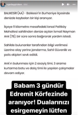 Survivor Ogeday ilk paylaşımında, kayıp haberini alıntılayarak, "Babam 3 gündür Edremit Körfezinde aranıyor! Dualarınızı esirgemeyin lütfen" ifadesinde bulunmuştu.