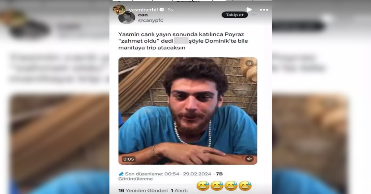 Yiğit Poyraz'ın canlı yayın hakkının sonunda yayına katılan Yasmin Erbil'e sevgilisi adeta trip attı. Survivor Poyraz "Yasmin Erbil şimdi katıldı iyi oldu katıldığın zahmet oldu aşkım" dedi.