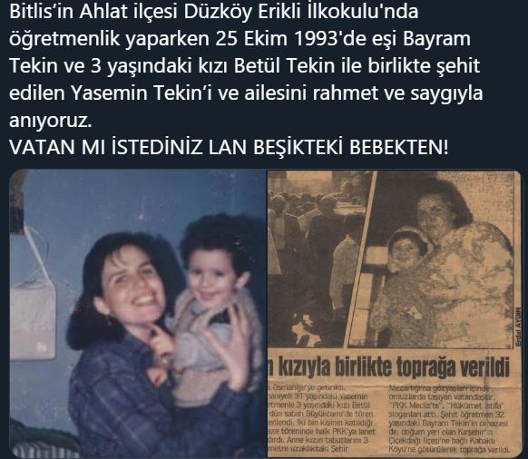 Bitlis’in Ahlat ilçesi Düzköy Erikli İlkokulu'nda öğretmenlik yaparken 25 Ekim 1993'de eşi Bayram Tekin ve 3 yaşındaki kızı Betül Tekin ile birlikte terör örgütü PKK tarafından şehit edilen Yasemin Tekin’i ve ailesini rahmet ve saygıyla anıyoruz.