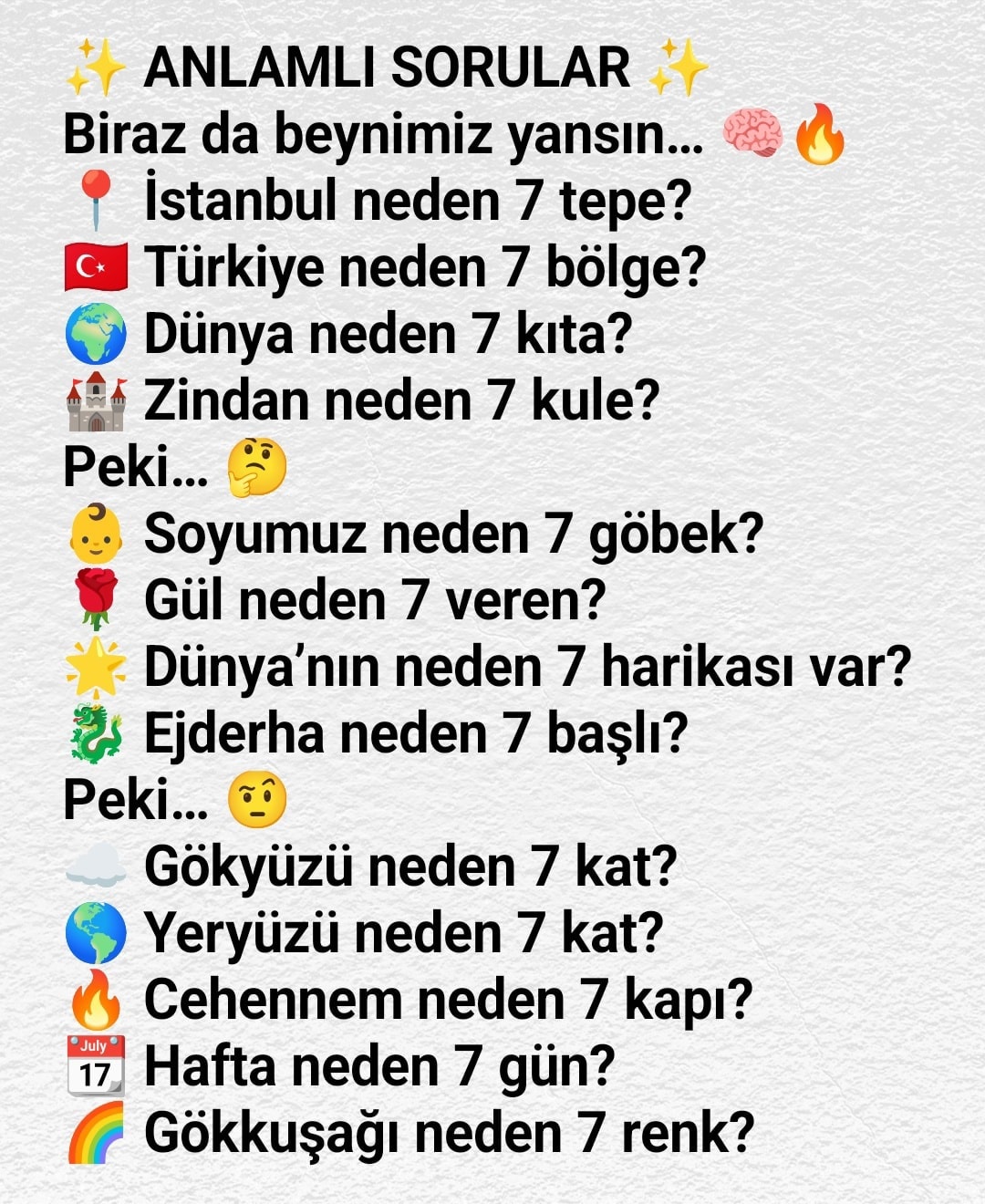 Kuran-ı Kerim’in ilk suresi Fâtihâ, 7 âyettir. Dinimiz İslam’da 7 mertebe vardır. Topkapı Sarayı’nın 7 büyük kapısı vardır. 7 tane baş melek vardır. Mitolojide 7 esas tanrının var olduğu düşünülür. Tibet’te 7 Buda vardır. İnsan yüzünde 7 kapı vardır. Müslümanlıkta 7 kat cennetten bahsedilir. Eshab-ı Kehf olayı, Yedi Uyurlar olarak bilinir. Büyük ayı takım yıldızlı 7 yıldızlıdır. Roma rakamı sisteminde 7 harf vardır. İstanbul, Roma ve Kudüs’te 7 tepe vardır. Dünyanın 7 harikası vardır. Cuma namazının yedi farzı vardır. Yahudilerde kutsal şamdan 7 mumludur. Osmanlı kurulduktan sonra yedinci asırda yıkılmıştır. Kızılderililere göre mevsimler 7 tanedir. Ailede soy yedi göbeğe kadar çıkarılır. Bir uğur böceği genellikle yedi lekeye sahiptir. Memelilerin boyunlarının çoğunda yedi kemik bulunur. Periyodik cetvel tablosundaki satır sayısı yedidir. Dijital cihazlar yedi segmentli bir ekran kullanır. Çıplak gözle görülebilen gök cisimlerinin sayısı yedidir. Kefene yedi arşın bez de denir. Mevlana’nın yedi öğüdü vardır.