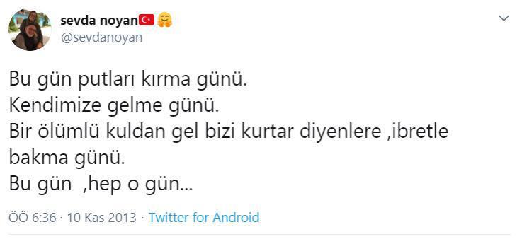 2014 yılında Fethullah Gülen için "Niyetimiz ahiret birlikteliği" diyen Sevda Noyan, 10 Kasım 2013 tarihinde sosyal medya hesabından Atatürk'ü hedef alan bir paylaşımda bulunuyor.