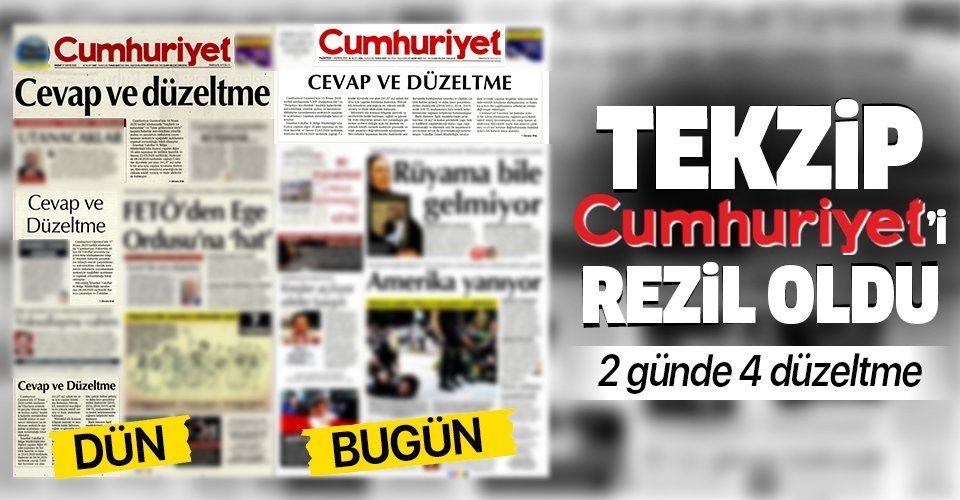 Cumhuriyet Gazetesi, yaptığı yalan haberlerle ilgili olarak dün biri manşetten olmak üzere ilk sayfasından 3 adet tekzip metni yayınlamıştı. Aynı gazete bugün de manşetinden "Cevap ve düzeltme" başlığı ile bir tekzip metni yayınladı. Yayınlanan tekzip metinleriyle birlikte yalan haberlerle algı operasyonu yapan Yeni Cumhuriyet'in ipliği bir kez daha pazara çıkmış oldu.