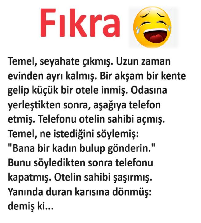Temel, seyahate çıkmış. Uzun zaman evinden ayrı kalmış. Bir akşam bir kente gelip küçük bir otele inmiş. Odasına yerleştikten sonra, aşağıya telefon etmiş. Telefonu otelin sahibi açmış.