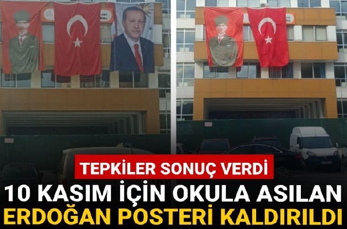 10 Kasım Atatürk’ü Anma Günü kapsamında Ümraniye’deki bir okula, Gazi Mustafa Kemal Atatürk’ün fotoğrafının yanında Erdoğan’ın da fotoğrafı asıldı. Olay, öğrenci velileri ve yurttaşların tepkisini çekti.