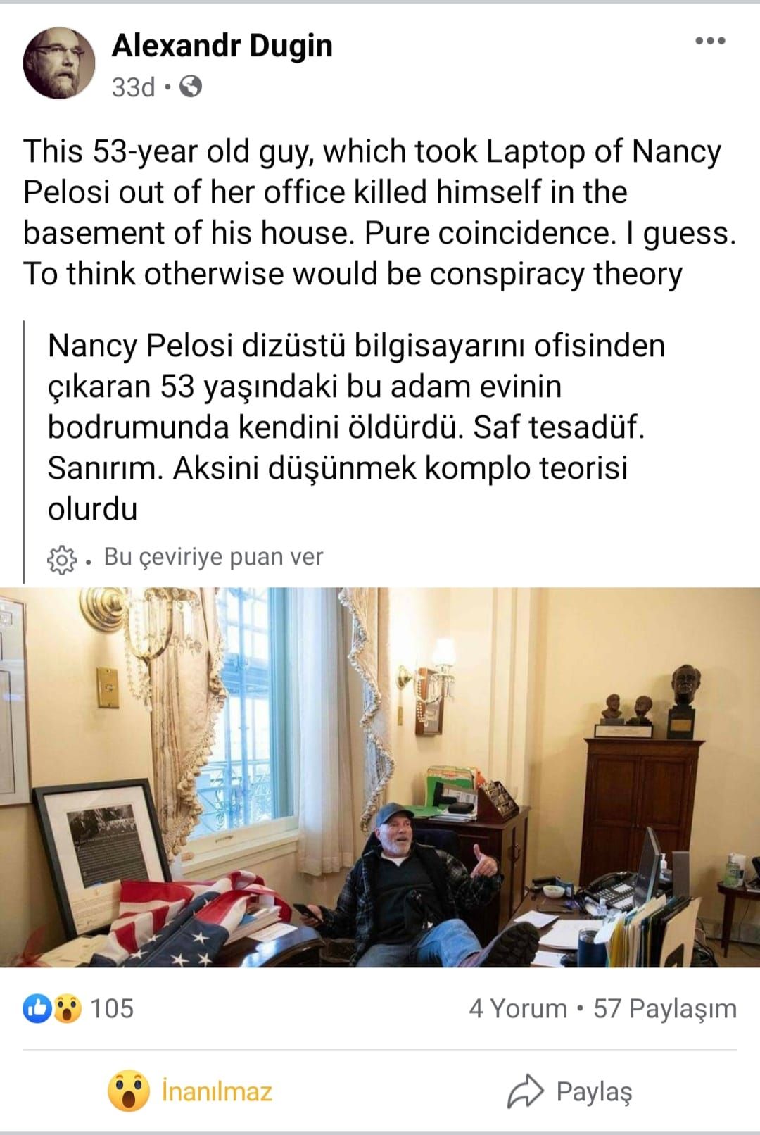 ABD Kongresini basan, meclis başkanı Nancy Pelosi'nin odasına girip dizüstü bilgisayarını alan protestocu , evinin bodrumunda " Kendini asmış " olarak bulundu . Ne güzel değil mi ABD demokrasisi, ister misiniz size de getirsinler demokrasi ?
