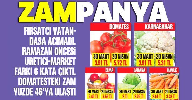 Domatesi, yüzde 35.82 ile karnabahar, yüzde 22.20 ile elma takip etti. Ramazan ayı öncesinde üreticimarket fiyatı farkında ise başı 6.4 kat ile lahana, 4.9 kat ile kuru incir, 4 kat ile elma ve maydanoz çekti. Üreticide 35 kuruş olan lahana markette 2,25 liraya, 13 lira olan kuru incir 63,70 liraya, 1,63 lira olan elma 6,59 liraya, 50 kuruş olan maydanoz 1.98 liraya satıldı.