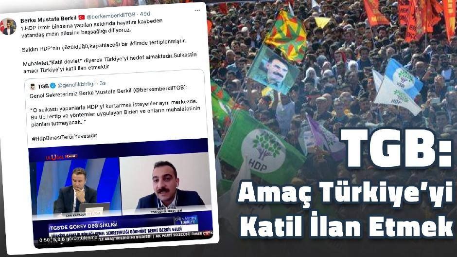 TGB Genel Sekreteri Berke Mustafa Berkil, “HDP İzmir binasına yapılan saldırıda hayatını kaybeden vatandaşımızın ailesine başsağlığı diliyoruz. Saldırı HDP'nin çözüldüğü, kapatılacağı bir iklimde tertiplenmiştir. Muhalefet, “Katil devlet” diyerek Türkiye'yi hedef almaktadır. Suikastın amacı Türkiye'yi katil ilan etmektir” diyerek asıl hedefin Türkiye olduğunu vurguladı.