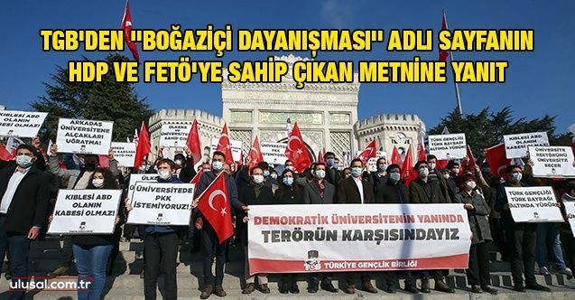 TGB açıklamada, ''Amaçlarının rektör değişimi değil, PKK ve FETÖ'yü kurtarmak olduğu ortadadır!'' diyerek Boğaziçi Üniversitesi üzerinden Türkiye'yi karıştırmaya çalışanların terör örgütleriyle ilişkilerinin ortaya çıktığını ifade etti.
