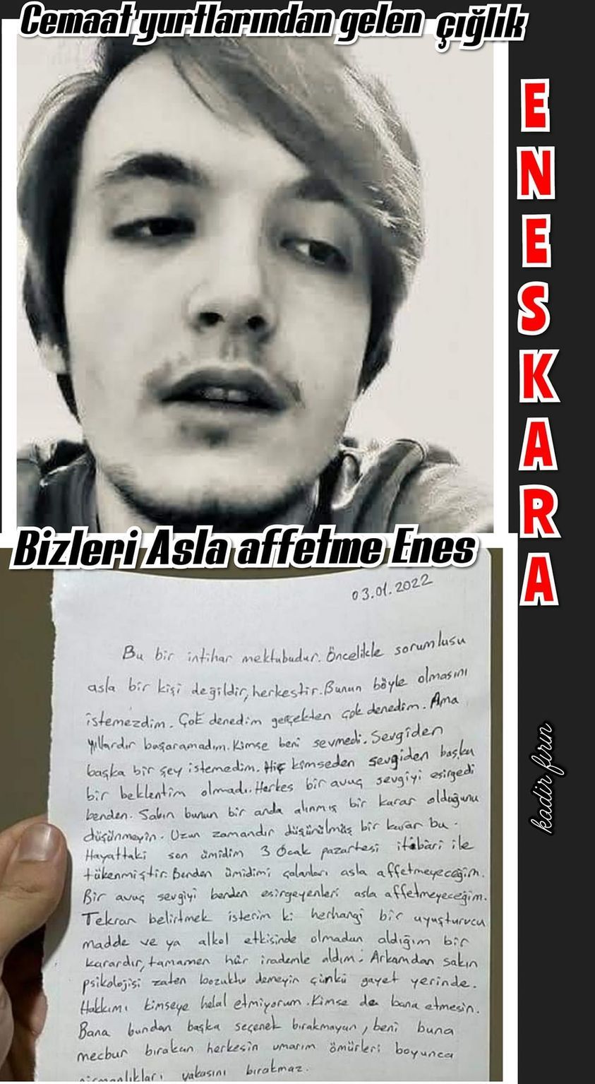 Kaldığı Cemaat yurdunda cansız bedeni bulunan 20 yaşındaki Enes Kara'nın bıraktığı intihar notunda;