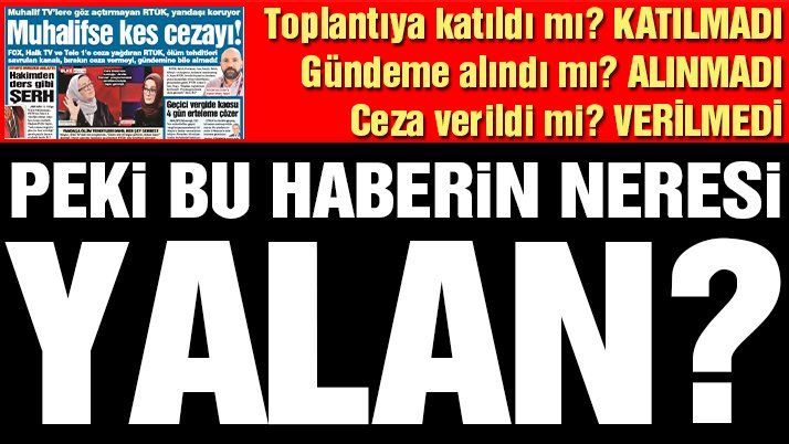 “Muhalif TV'lere göz açtırmayan RTÜK, yandaşı koruyor” üst başlıklı ve “FOX, Halk TV ve Tele 1'e ceza yağdıran RTÜK, ölüm tehditleri savrulan kanalı, bırakın ceza vermeyi, gündemine bile almadı!” alt başlığıyla duyurulan “Muhalifse Kes Cezayı” başlıklı Sözcü Gazetesi'nin manşeti mesnetsiz, gerçek dışı ve hayal mahsulüdür.