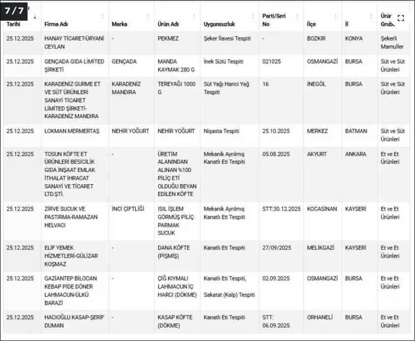 Konya’nın Bozkır ilçesinde üretim yapan bir firmanın pekmezinde ilave şeker tespit edilirken, Ankara’nın Akyurt ilçesinde yüzde 100 piliç eti olduğu belirtilen köftede mekanik ayrılmış kanatlı et kullanıldığı ortaya çıktı.