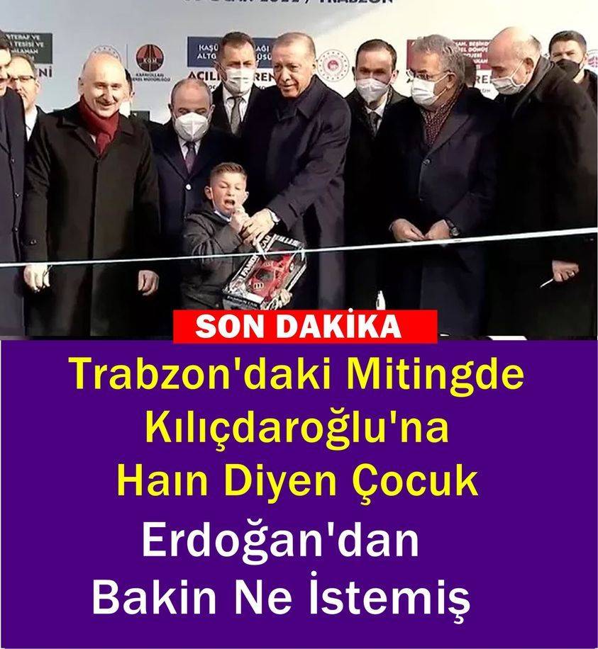 Cumhurbaşkanı Recep Tayyip Erdoğan, Trabzon'da Toplu Açılış Töreni'ne katıldı. Erdoğan, konuşmasını gerçekleştirdikten sonra beraberindeki heyeti ve bakanları kurdele kesme töreni için sahneye davet etti. Bu sırada Erdoğan, ağlayan bir çocuğu görünce korumalarına talimat vererek sahneye aldırdı.