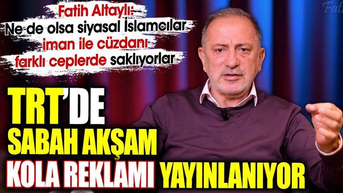 Boykot edilen ürün ve markaları satın alan vatandaşlara yönelik saldırılar artarken, Fatih Altaylı konuya ilişkin dikkat çeken bir örnek verdi. TRT’nin, boykot ürünleirnden biir olan Coca Cola’nın reklamlarını düzenli olarak yayınladığını vurgulayan Altaylı, “TRT, düzenli olarak CocaCola reklamları yayınlıyor. İktidar yanlıları ise bu duruma sessiz. Ne de olsa siyasal İslamcılar, iman ile cüzdanı farklı ceplerde saklıyorlar.” ifadelerini kullandı.