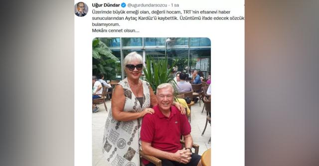 Sosyal medyadan duyurdu Arkadaşının ölümüyle yıkılan gazeteci Uğur Dündar, üzüntüsünü sosyal medya hesabından duyurdu. Uğur Dündar'ın paylaşımı Uğur Dündar paylaşımında "Üzerimde büyük emeği olan, değerli hocam, TRT'nin efsanevi haber sunucularından Aytaç Kardüz'ü kaybettik. Üzüntümü ifade edecek sözcük bulamıyorum. Mekânı cennet olsun..." sözlerini kullandı.