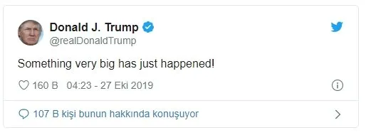 ABD Başkanı Donald Trump'ın "çok büyük bir şey oldu" şeklindeki paylaşımı kamuoyunda merak uyandırırken, DEAŞ lideri Ebubekir elBağdadi'nin İdlib'de ABD birliklerinin düzenlediği bir operasyonda ölmüş olabileceği iddia edildi.