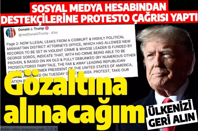 Donald Trump paylaşımında 'Protesto edin ve ülkenizi geri alın" ifadelerini kullandı. New York polisi Trump'ın suçlanabileceği ihtimaline karşı güvenlik hazırlıkları yaparken eski başkanın suçlu bulunup bulunmayacağına ilişkin ise herhangi bir bilgi paylaşılmadı.
