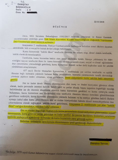 HKP’nin avukatları, açtıkları davada, TSK’daki türban serbestisinin, Anayasa'daki laiklik ilkesine, Anayasa Mahkemesi’nin önceki kararlarına aykırı olduğunu belirtti. Avukatlar, serbestlik düzenlemesinin orduyu ve subayları bir din devleti yapılanmasına doğru götüreceğini ileri sürerek, düzenlemenin Danıştay tarafından iptal edilmesini istedi.