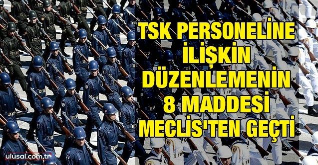 Milli Savunma Bakanlığı kadrolarında görevli personelin tecrübelerinden daha uzun süreli ve etkin şekilde yararlanılması, özlük haklarının iyileştirilmesi gibi düzenlemeleri içeren Türk Silahlı Kuvvetleri (TSK) Personel Kanunu ile Bazı Kanunlarda Değişiklik Yapılmasına Dair Kanun Teklifi'nin birinci bölümünde yer alan 8 maddesi, TBMM Genel Kurulu'nda kabul edildi.