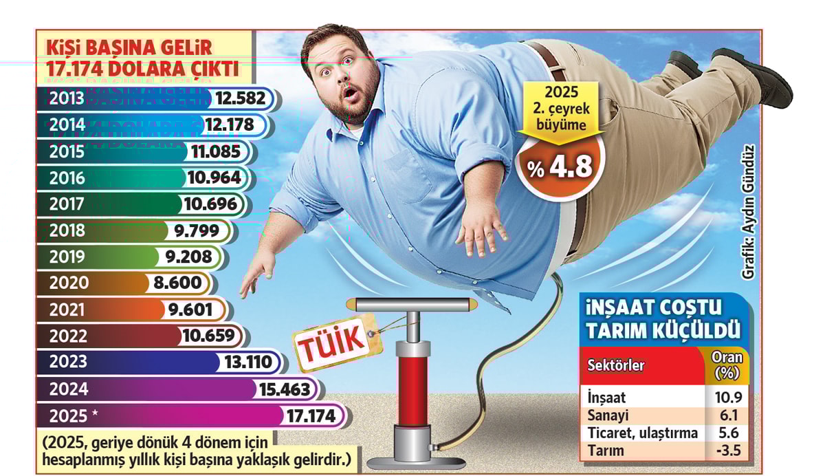 Enflasyonda yıllardır pembe tablo çizen Türkiye İstatistik Kurumu (TÜİK) şimdi de halkın zenginleştiğini ilan etti. Vatandaş açlık sınırında yaşıyor ama TÜİK’e göre, kişi başına milli gelirimiz rekor kırdı ve 17 bin 174 dolara çıktı. Türkiye ekonomisi de 6 ayda dolar bazında yüzde 8.5 büyüyerek 1.5 trilyon dolara yaklaştı. Ancak inşaat sayesinde büyümüş görünsek de tarımı kaybettik. Ülkeyi besleyen tarım sektörü büyüyemediği gibi yüzde 3.5 oranında küçüldü. Veri önümüzdeki dönemde gıdanın daha da pahalanacağının, tarım ithalatının artacağının tehlikeli sinyalini verdi. TÜİK bu yılın 2’nci çeyrek büyüme verilerini açıkladı.