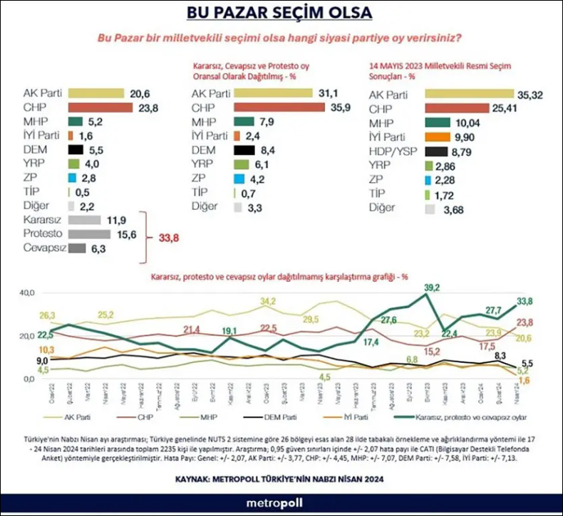 CHP, 31 Mart 2024 Yerel Seçimlerinde 37,7 oy oranına ulaşarak birinci parti olmuştu. Yapılan ankette kararsızların dağıtıldığı oranlara göre DEM Parti, 8,4 ile 3’üncü, MHP 7,9 ile 4’üncü, YRP 6,1 ile 5’inci, Zafer Partisi ise 4.2 ile 6’ıncı parti oldu. Ankete göre 14 Mayıs 2023 Genel Seçimlerinde 9,9 oy alan İYİ Parti’nin oy oranı 2,4 olarak 7’inci parti olarak kaydedildi. TİP ise 0,7 oy alarak 8’inci parti oldu.