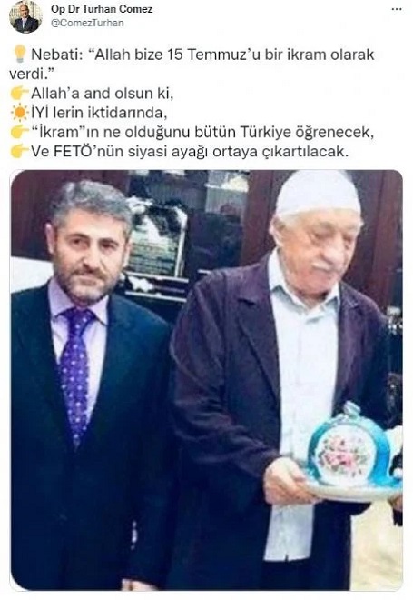 Bakan Nebati’nin FETÖ lideri Fetullah Gülen’le fotoğrafını paylaşan Çömez mesajında; “Nebati: “Allah bize 15 Temmuz’u bir ikram olarak verdi.” Allah’a and olsun ki, İYİ’lerin iktidarında, “İkram”ın ne olduğunu bütün Türkiye öğrenecek, Ve FETÖ’nün siyasi ayağı ortaya çıkartılacak.” ifadelerini kullandı…