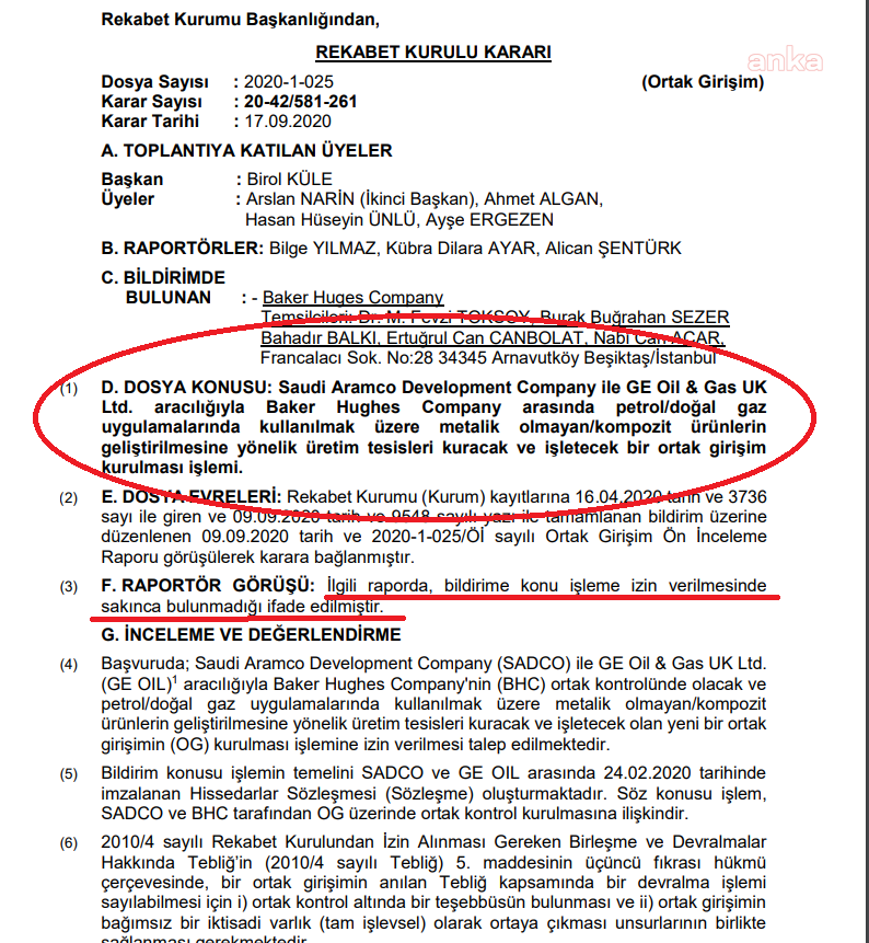 Rekabet Kurumu kayıtlarına 16 Nisan’da giren başvuru 9 Eylül’de onaylandı. 'Ortak Girişim Ön İnceleme Raporu' sonucunda, Saudi Aramco Development Company ile GE Oil & Gas UK Ltd. aracılığıyla Baker Hughes Company arasında petrol/doğal gaz uygulamalarında kullanılmak üzere metalik olmayan kompozit ürünlerin geliştirilmesine yönelik üretim tesisleri kurma ve işletecek bir ortak girişim kurulması başvurusu oybirliğiyle kabul edildi.