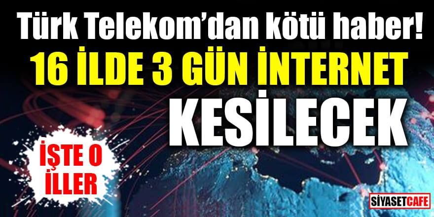 Türk Telekom’un yarından itibaren 16 il ve birçok ilçe ve merkezde 3 gün süreyle internet hizmetinde kesintilere gideceği bildirildi.