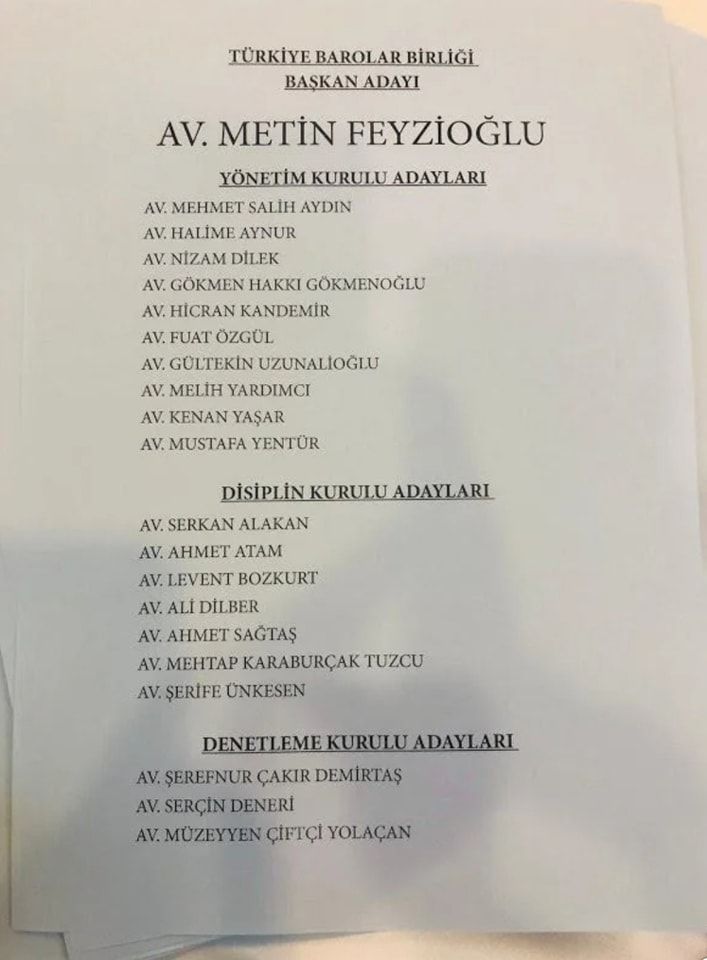 Metin Feyzioğlu’nun 10 kişilik yönetim kurulu listesinde 8 baro başkanı yer alırken, Erinç Sağkan’ın listesinde 5 baro başkanı bulunuyor.