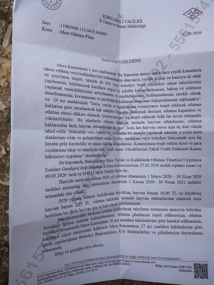 Avukat Onur Cingil, Kırklareli Valiliği İl Tarım Orman Müdürlüğü tarafından dağıtım yerlerine gönderilen "Mera Otlatma Planı"nı paylaştı.