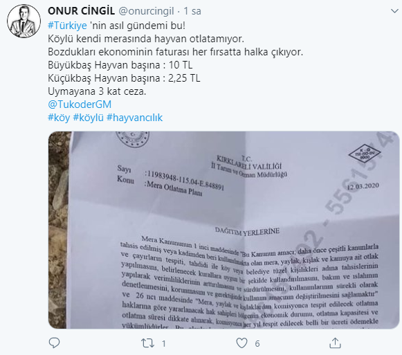 "Türkiye 'nin asıl gündemi bu! Köylü kendi merasında hayvan otlatamıyor. Bozdukları ekonominin faturası her fırsatta halka çıkıyor. Büyükbaş Hayvan başına : 10 TL Küçükbaş Hayvan başına : 2,25 TL Uymayana 3 kat ceza."